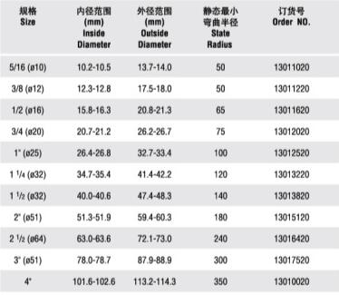 產(chǎn)品規(guī)格:內(nèi)徑范圍 外徑范圍 靜態(tài)最小彎曲半徑