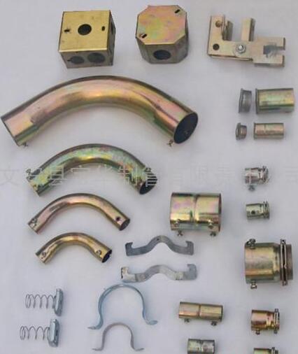 穿線管是用于承載零星線纜的設(shè)施,一般嵌入安裝在墻體或地面內(nèi),作為用戶端底盒到房間頂部(或防靜電地板下方)橋架的穿線通道.也可作為底盒到底盒之間的穿線通道。穿線管按材料可分為金屬穿線管和塑料穿線管,金屬穿線管一般用于對(duì)承載設(shè)施的接地和屏蔽性能要求要高的場(chǎng)合。穿線管的規(guī)格通常按直徑進(jìn)行劃分,單位為mm,如 16、 20、 25、 32等。各類穿線管及其附件如圖所示。